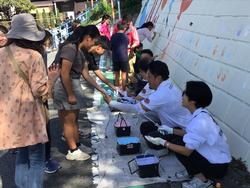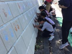 10月18日、昨日に引き続き壁画制作作業を行いました。この日は、お世話になっている地域の方々にお声をかけ、手形を押していただきました。