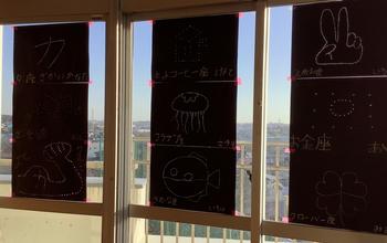(2組)理科の「光はまっすぐ進む」から自分達で考えた未来の星座(未来を願って)に名前を付けて音楽ホールに掲示しました。時間によって見え方が変わることやより見える方法を考え工夫してみました。