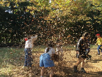 まん丸広場では、秋探しをして木の実を集めたり、虫を観察したりしました。また、枯葉で楽しく遊ぶなど、秋を満喫することができました。