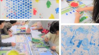 図工室に入ると、子どもたちが楽しそうに造形活動に取り組み中。集めてきた身辺材を使って熱心に版作りをしていました。ダンボール・プチプチ・ストロー・紐などの組み合わせを試行錯誤しながら、一人一人が版を作り上げる過程を見ていると、子どもたちの感性の豊かさが伝わって来ます。また、出来上がった版に色をつけて写す際には、イメージに合う色を選び、どのように写るかを想像している姿が微笑ましいですね。同じ版を使って、少しずつ回転させてみたり、別の色をつけてみたりしながら、版の素材による違いを発見することで、感性が一層刺激されているようです。「あっ、○○みたい。」「本当だ。こっちから見ると、◇◇にも見えるよ。」と、友達同士のかかわりも自然と生まれ、作品の出来上がりが楽しみになってきました。