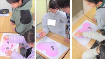 音楽交流会で一緒に演奏した10月に続き、今回は朝の会から一緒に過ごしました。朝の会では、当番の子のスピーチを聞いたり、歌を歌ったり。体育では、お話しをしながらグランドを周ったり、『いろはにこんぺいとう』を楽しんだりしました。また、音楽では『もりのたんけんたい』を歌ったり、楽器で演奏したり。「いっぱい歌ったから、お腹がすいたよ。」との呟きも。4時間目の外国語活動では、ハートちゃんのふくわらいを一緒に楽しみました。友達とペアになり、“up” “left”などと上手にリードしてあげながらできたハートちゃんを見合いながら、笑顔が弾けていました。素敵な時間です。