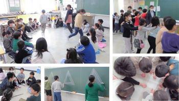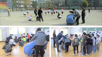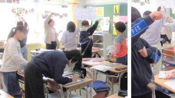 前回に続き、今回も朝から一緒に過ごしました。体育では、『ペース走』を一緒にしながらお話ししたり、『だるまさんが○○した』を楽しんだりしました。「寒くない?」と、優しく声をかける子の姿も見られました。また、外国語活動では"Simon says."のゲームをしたり、輪になって"London Bridge Is Falling Down"を歌いながら一緒にぐるぐる回ったりして楽しみました。「一緒にやったから楽しかった。」と、にこにこしながら低学年の子が感想を話してくれました。副学籍交流を通して一緒に学ぶことができることは、素敵な時間ですね。