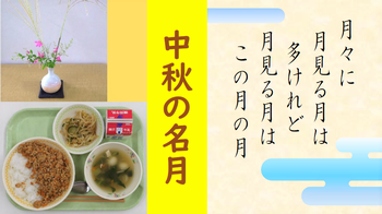 昨日の朝会で、『中秋の名月』について話をしました。古より “月々に月見る月は多けれど月見る月はこの月の月”と歌に詠まれてきた中秋の名月。毎月のように月を見るけれども、名月を見るには今月の月が一番だという意味であることを伝えました。また、日本では ‘餅つきをするウサギ’ に見える模様は、南ヨーロッパでは ‘カニ’ 、北ヨーロッパでは ‘本を読むおばあさん’ 、南アメリカでは ‘ワニ・ロバ’ など、様々な見方があることを紹介。校内ですれ違った子どもたちは、「昨日は雲に隠れちゃって少ししか見えなかったから、今日見てみる。」と話していました。給食も行事食。月見汁に入っていた団子を嬉しそうに食べる子どもたちが微笑ましかったです。本日は十六夜の月ですが、月を見ることはできるでしょうか。家族みんなで、中秋の名月を眺めながら月見団子を頬張り、ゆったりとした時間を過ごしてみてください。