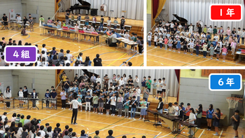 「校長先生も見に来るの?」「いっぱい練習したから大丈夫。」など、登校時の正門で出会った子どもたちの声は様々。4組は、『小さな世界』の3部構成(斉唱・合奏・英語で斉唱)でした。合奏では他のパートの音をよく聞いて演奏する姿が素敵でしたね。年間を通して交流している特別支援学校の子も一緒に演奏しました。最後のポーズもバッチリ。1年生は、替え歌からスタート。手話付きの歌は、歌声と動作がぴったり合っていて、立派に成長した姿を見せてくれました。“友達になるために人は出会うんだ 誰かを傷つけても幸せにはなれない”という歌詞の部分がとくに素晴らしかったですね。6年生は『情熱大陸』の合奏。「速さが変わるところに注目してほしい。」と意気込みを述べて演奏開始。楽器の種類も多くリズムを合わせることが難しかったと思いますが、さすが最高学年です。力強い演奏が体育館に響き渡っていました。全員合唱では、体を揺らしながら『世界がひとつになるまで』を歌う低学年の子どもたちも見られ、微笑ましかったです。