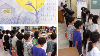 先週、子どもたちから招待状が届いたので、教室に行ってみると…。教室がミニコンサート会場に早変わり。「虫の声が種類によって違うように歌うので、ぜひ聞いてください。」と、力強い言葉からスタートしました。マツムシの♪チンチロリンは元気に、スズムシの♪リーンリンは優しく、コオロギの♪キーリキリはリズム良く、クツワムシの♪ガチャガチャはとても元気に、ウマオイの♪スイッチョンは楽しそうに歌い分けていて、大変素敵な歌声。地声ではなく、虫になった気持ちで美しい音色が教室に響き渡りました。ありがとう。次は、どんな歌を聞かせてくれるのか、今から待ち遠しいです。