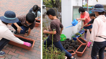 火曜日の委員会活動の時間に『ツルコザクラ』の種まきをしました。今年の春に咲き終わったツルコザクラから採取した種のため、子どもたちも少々感慨深げの様子。環境レンジャーの方に教えていただきながら、ふわふわになった土に種まきする表情が微笑ましいですね。水をあげたり、生長の様子を毎日観察したりしながら、多くの?や!を見つけてほしいと願っています。環境レンジャーの方からは、「ついに、ツルコザクラの栽培が2年目を迎えて嬉しい。去年以上にきれいな花を咲かせてほしい。」との声。こうして、地域の方々と協働する姿は、『ひ・が・し・な』の『ひ』につながりますね。