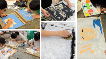 小学校最後の木版画に取り組む子どもたち。一人一人の思い出のワンシーンを版画に仕上げていくために、下絵・彫り・刷り・着色の作業工程があります。本日は、彫り・刷り・着色を頑張っていました。これまでに学んだことを活かし、「うーん、この部分はぼかしたいから、平刀かな。」と、自分の思いに合った作品にするために彫刻刀の選択に迷う姿も。また、彫る方向にも注意し、あえて彫り残しを作る子も。インクをつけて版画用紙に刷る際の表情は真剣でした。そして、刷った用紙の裏側の着色では、何度も表側をめくって絵の具のうつり具合を確認しながら作業していました。試行錯誤しながら版での表現を楽しみ、造形的な特徴を感じ取ってほしいものですね。