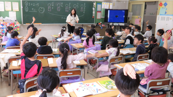 教室から子どもたちの笑い声が…。そっと入ってみると、『単位』について学んでいる様子。「折り紙は1枚、2枚…って数えていくけど、林檎も1枚、2枚って数えるのかな?」との問いに対して、「それだと、林檎がぺらぺらした紙みたい。」と笑っていたようです。「林檎は1個、2個…って数えるよ。」と子どもたちが答えると、「じゃあ、鉛筆は?」「本は?」「車は?」…と様々なものが提示されます。子どもたちは、すかさず「本」「冊」「台」…と答えながら、日本語には様々なものの数え方である単位があることを学んでいました。ロケットは1台、2台…と数えることを知った子が、「車も1台、2台…って数えていたから、機械みたいなものは台って数えるんじゃないかな。」と呟いていました。感性が素敵ですね。他にはどんなものの数え方(単位)があるか、ぜひこの週末にお子さんと探してみてください。