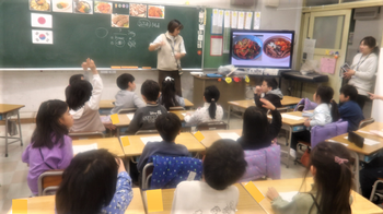 3回目の今回のトピックは『食べ物』。IUIの先生から「日本オリジナルの食べ物は?」と聞かれた子どもたちは、おにぎりや味噌汁などを挙げていました。「知っている韓国の食べ物は?」との質問には、ビビンバ・キムチ・焼肉など多くの食べ物が挙がりました。「この間の給食でビビンバが出ていたよ。美味しかった。」と、お互いの食文化が浸透していることを改めて感じた子どもたち。そして、あるゼリーの写真が提示されると、「羊羹みたい。」との反応。“トトリム(도토리묵)”と呼ばれるどんぐりゼリーであることが分かると、子どもたちはびっくり仰天!どんぐりのデンプンを固めた伝統的な食品で、たれと共に野菜などと和え、おかずとして食べられているとのこと。デザートと思っていた子どもたちは、またまたびっくり仰天!「どんな味なのか食べてみたい。」「作ってみたい。」と、韓国の食文化への関心を高めていました。トトリムは、日本の蒟蒻のような感じなのですね。