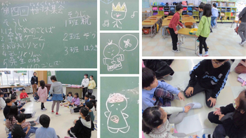 本日の樹木活動も掃除の時間からスタート。集合教室への移動が終わると、掃除タイムです。6年生や5年生だけでなく、困っている場面で手助けする4年生の姿も見られ、温かい気持ちになりました。今回は、5年生が中心となって進める回のため、5年生の子どもたちは緊張気味。「ちょっと不安。うまく説明できるかどうか心配。」「時間通りに進めることができるかな。」など、ドキドキが伝わってきました。黒板にイラストを描いている5年生も見られ、「うわぁ、すごい。ゲームしているところかな。」と、1~3年生がにこにこ笑顔になっていました。『王様ゲーム・覚えしりとり』の2つは前半共通ですが、もう一つのゲームはそれぞれの班独自のようでした。『ボール回しゲーム』や『絵しりとり』など、班のみんなが楽しめるゲームを考えて臨んだ5年生が素敵です。終了後、5年生に話を聞いてみると、「6年生のようには上手くいかない。やっぱり、凄いな。次は、分かりやすく説明できるようにしたい。」とのこと。6年生は「去年の私たちよりもしっかりできていると思う。ゲームを工夫していて良かった。」との声。小学校ならではの異学年交流は、豊かにかかわる絶好の機会ですね。