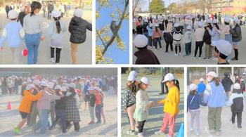 今回は、じゃんけん列車。6年生が1年生と手をつないで校庭に移動する姿も見られました。樹木班ごとに集合する際には、6年生だけでなく5年生も積極的に下級生に声をかけ、素早く整列。センダンの実を食べにやって来たヒヨドリの群れが、子どもたちの様子を伺う中、まずは樹木班の中でペアをつくってじゃんけん。勝った子の後ろに負けた子が回り、樹木班の中で2回目のじゃんけん…。そして、樹木班が1つの列になると、いよいよ他の樹木班の子とのじゃんけんです。学年に関係なく、「あっちに行こうよ。」「さっきみたいに頑張って。」と、応援の声が飛び交っていました。喜んだり、残念がったりする表情が校庭の様々な場所で見られ、和気藹々とした雰囲気に包まれる異学年交流は、ヒガシナのすてきです。