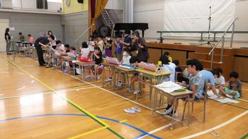 体育館では、4組の子どもたちが集合して音楽交流会へ向けた練習をしています。様子を見ていると、『It's a small world (ちいさなせかい)』の合奏と斉唱の合体版。まずは、1年生から6年生がカスタネット・トライアングル・鍵盤ハーモニカ・ソプラノリコーダー・鉄琴などのパートごとに練習。その後、みんなで合わせてみることに。「他の楽器の音を聞いていると、間違えそうになっちゃう。」「鍵盤ハーモニカは得意なんだ。」「同じ楽器の友達と音が合うように頑張りたい。」等、真剣な様子でした。そして、斉唱は英語です。新たなチャレンジですね。当日へ向けて練習を重ね、4組の子どもたちのハーモニーが体育館中に響き渡ることを楽しみにしています。