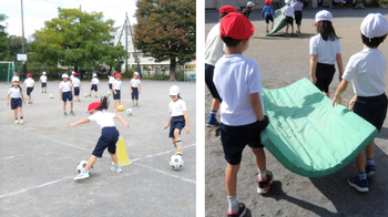 雪が積もった富士山を遠くに眺めながら、校庭では子どもたちが元気に活動しています。1組の子たちは『ボールあそび』。まずは、一人一人がボールと仲良くなるために、ボールと散歩をしたり、ボールを左右の足の裏で交互に触ったりしたりしながら楽しみました。そして、ペアになってのボールキャッチ。ペアの友達へ目がけてボールを蹴りますが、なかなか思うように転がりません。「ゆっくりでいいからね。」「足の横のところでやってみたら。」「ボールをちゃんと見ないと空振りしちゃう。」等、見合ったり、教え合ったりする姿が見られました。2組の子たちは『鉄棒あそび』。つばめの姿勢・前回り等のほか、足抜き回りにチャレンジする場面も見られました。「ちゃんと膝を曲げてやったらできた。」「手が鉄棒から離れそうになっちゃうから、次はがんばる。」等の声。鉄棒の下に敷いたマットを片付ける際には、ほとんどの子が友達と一緒に丁寧に運ぶ姿が見られました。素敵ですね。