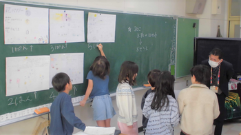 2組の子どもたちから教室に来てほしいと言われたので、行ってみると…。「来てくれて、ありがとうございます。育てたい花の種類と理由について6つの班ごとに発表するので、聞いてください。」とのこと。ヒガシナタイムとして “花を通して学校や学校前を通る地域の方々に笑顔になってほしい” という活動に取り組んでいる子どもたちは、次の活動として冬でも咲く花を寄せ植えにした鉢を作りたいという思いをもっているようです。先日、代表の子どもたちが校長室に来た際、時期に合った花の種類や選定理由を調べた上で話してほしいと伝えてあったので、それ以降、図鑑で調べたり、地域のお花屋さんに聞きに行ったりしながら、班ごとに結果をまとめることができました。「お花屋さんから○○の花は横に広がるって教えてもらったので、寄せ植えにぴったりだと思いました。だから、☆色の◇◇の花と一緒に植えれば、ちょうどいい鉢ができると考えました。」と、収集した情報を自分たちで分析を加え、画用紙に整理しながらプレゼンする姿が大変頼もしいですね。生活科でお世話になった地域のお花屋さんとのかかわりも見られ、学びのつながりも感じました。さあ、今後の学びが楽しみになってきました。