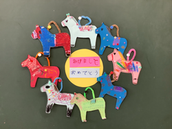 5組の総合の学習で、ビーズやクレパスを使って絵馬を作りました。