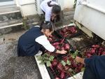 11月5日(水)、2年生は半日、自然体験となりました。1,2時間目は、地域の公園で自治会の公園管理部の方やボランティアの方と一緒に花と球根を植えました。3,4時間目は、学校の畑に植えていたサツマイモの収穫をしました。今年はぷっくり丸々と太ったサツマイモがたくさん収穫できました。採れたサツマイモは、今月の12日の味噌汁の具となり全校に配食されます。今から楽しみです。土づくりからお世話になった「つちのこ」の会の皆様、ありがとうございました。