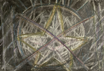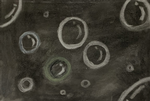 5年生の作品が廊下でみんなの目を引きつけています。この作品はまず、画用紙をコンテで丁寧に黒く塗ります。次に、消しゴムで消した部分が絵の模様となっていきます。いつもは消す道具として使う消しゴムが筆のような働きをするのです。そうしてできた模様にクレパスで色をつけると完成です。普段なかなか見られない作品に子どもたちも大注目しています。