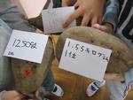 早速、授業で「収穫数」や「重さ」の学習。なんと「170 個!」「1,55 kg!」 全校にも見てもらうために、校長室前に、重さ上位3つを置きました。