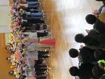 最後に、6年生から在校生に、「挑戦」「あいさつ」「助け合い」の大きなメダルが贈られました。在校生を代表して5年生がしっかりと受け取りました。