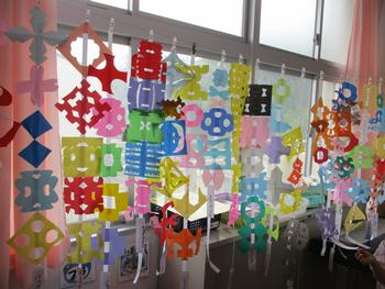 紙テープでつなげ、教室が華やかに飾られました。 すてき!