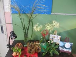 校庭のススキ、白い彼岸花、そしてザクロ。赤い彼岸花と小さな栗は、子どもが届けてくれました。大きな栗は地域の方が届けてくれました。どんぐりは誰が届けてくれたのか、いつの間にか、そっと置いてありました。机の端には、いわさきちひろさんのポストカードを置かせてもらいました。