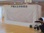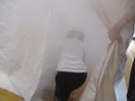 続いて、煙体験室に、練習用の煙を充満させました。(写真でわかるでしょうか?) その部屋を子どもたちが、入口から出口まで約5m進みました。
