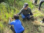 10月30日に、5組の田んぼで稲刈りを行いました。当日は、田んぼ作りのはじめからご指導をいただいた地域の方に、稲の刈り方を教わりました。
