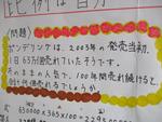 ・めんつゆの味をいつも同じ味にするには… ・人気のドーナツがこのまま100年売れ続けたら… ・毎月本を○冊読むと、△年では何冊読む? など、生活の場面から、比例の考えが応用できる事象を考えて、計算しています。