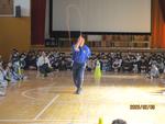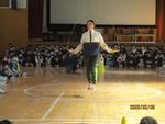 最初に、3人の職員によるなわとびの試技。子どもたちからも拍手が起きました。続いて、日本体育大学の学生さんのなわとびの試技、披露。