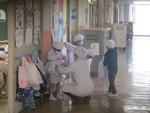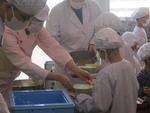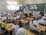 1年生も白衣を着て、給食の準備をしました。