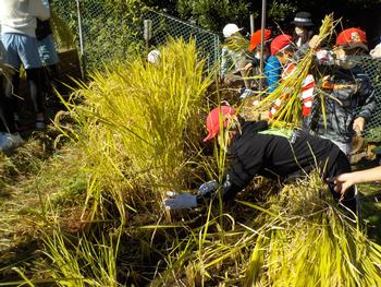 10月20日、秋晴れの中、5年生が稲刈りを行いました。