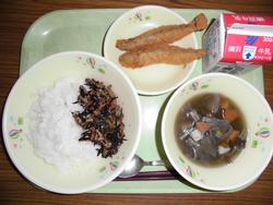 1日(水) ごはん 牛乳 ひじきごはんの具 ししゃもフライ けんちん汁 ★ししゃもは頭からしっぽまで丸ごと食べられるので、骨や歯を丈夫にする カルシウムをたくさんとることができます。 |