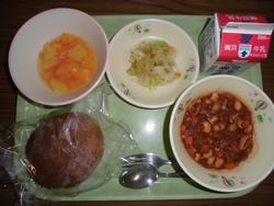 2日(木) はいがパン 牛乳 チリコンカーン 野菜ソテー ミックスフルーツ ★野菜ソテーはキャベツ、玉ねぎ、にんじんを炒めました。 野菜の甘味が感じられるソテーでした。 |