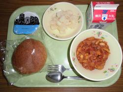 7日(金) 丸パン 牛乳 カレービーンズシチュー 野菜ソテー ミックスフルーツ ★給食は、低・中・高学年の身体の成長に合わせて、 必要な栄養の量が変わることから、パンの大きさやごはんの量、 おかずの量もかわります。 学年にあわせた食事の量を知り食べましょう。 |