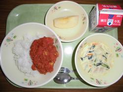 24日(金) ごはん 牛乳 チキンライスの具 クリームスープ りんご ★りんごは色々な品種がありますが、日本で一番多く作られているのは 「ふじ」という品種です。  |