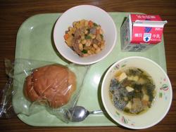 27日(月) ロールパン 牛乳 変わり五目豆 わかめスープ ★変わり五目豆はじゃがいもを油で揚げているので、 味がしみこんでおいしくなります。  |