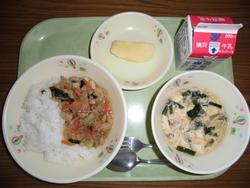 21日(火) はいがごはん プルーンはっこう乳 ポークカレー ごま酢あえ ★カレーの日の飲み物は「プルーンはっこう乳」がつきます。 はっこう乳はおなかの調子をよくする働きがあります。  |