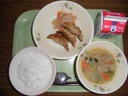 31日(金) ごはん 牛乳 揚げぎょうざ ゆで野菜 タンタンスープ ★タンタンスープは野菜やはるさめなどを使っていて、少しピリ辛の 味つけになっています。  |
