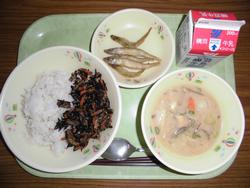 | 6日(木) ごはん 牛乳 秋味ごはんの具 揚げだいず 沢煮椀 |