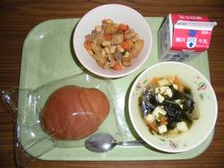 19日(水) ロールパン 牛乳 変わり五目豆 わかめスープ ★変わり五目豆のじゃがいもは油で揚げているので、味がしみこみおいしくなります。 |