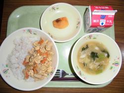6日(木) ごはん 牛乳 秋味ごはんの具 揚げだいず 沢煮椀 ★11月2日は十三夜でした。十三夜は「栗名月」ともよばれています。 今日は秋味ごはんの具に「くり」を入れました。 |