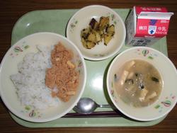 4日(火) 麦ごはん 牛乳 ひじきごはんの具 魚のから揚げ 呉汁 ★スメルトは、アユやわかさぎ、ししゃもなどの仲間です。 体長が10㎝くらいの小魚です。今日はからあげにしました。 |