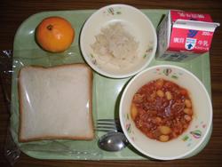 27日(木) 食パン 牛乳 チリコンカーン じゃがいものソテー みかん ★今日のみかんは静岡県産のものです。 みかんがおいしい季節になってきました。 |