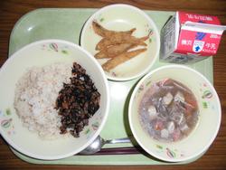 1日(月) はいがごはん 牛乳 ひじきごはんの具 きびなごフライ けんちん汁 ★根菜類は土の中にできるものを食べる野菜です。 今日のけんちん汁には、さといも、大根、にんじん、ごぼうと たくさんの根菜類を使いました。 |