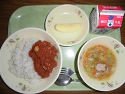 2日(火) 麦ごはん 牛乳 チキンライスの具 野菜スープ りんご ★りんごには、おなかの中をきれいにする食物せんいなどの 栄養素が多くふくまれています。 |