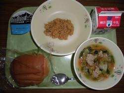 | 8日(月) ごはん 牛乳 豚肉とだいこんの煮物 煮びたし 納豆 |