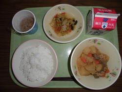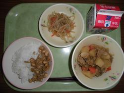 18日(木) ごはん 牛乳 肉じゃが からしじょうゆあえ だいずとじゃこの炒り煮 ★肉じゃがは味がよくしみこんでおいしくいただきました。 |