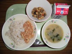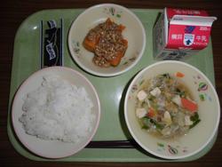 8日(月) ごはん 牛乳 豚肉とだいこんの煮物 煮びたし 納豆 ★県内産のだいこんを使いました。 味がしみ込んでおいしい煮物になりました。 |