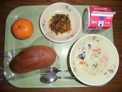 5日(金) はいがパン 牛乳 カレービーンズシチュー 野菜ソテー みかん ★季節の果物「みかん」で「ビタミン」をとることができました。 かぜなどの病気を予防します。 |