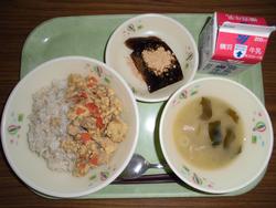 9日(火) はいがごはん 牛乳 ツナそぼろ 五目豆 みそ汁 ★五目豆は、日本で昔から食べられている伝統的な料理です。 「五目」とは「いろいろな材料が入っている」という意味です。 |